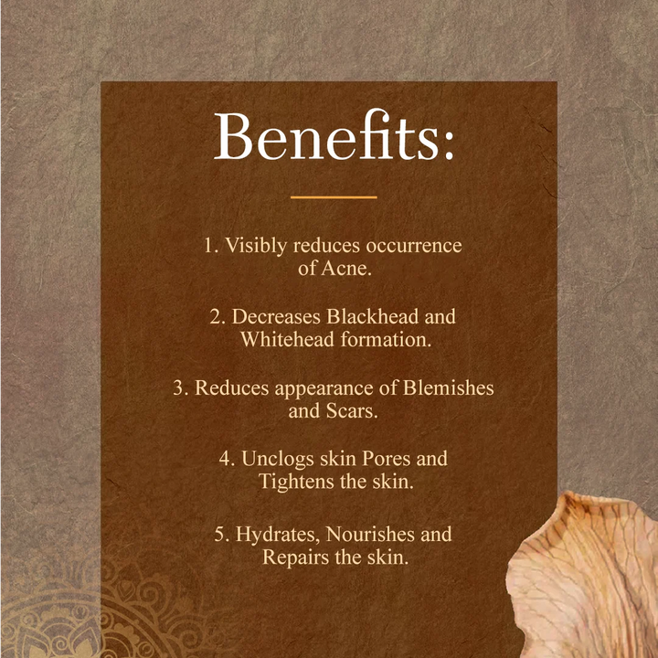 Anti-Acne Anti-Blemish Cream : The last step in this efficient skincare routine is our special Anti-acne Anti-blemish Cream, which uses our special 100-times washed ghee as the key ingredient, along with a few chosen natural ingredients to help brighten and tone your skin, while also fighting pimples, acne, blackheads and whiteheads.