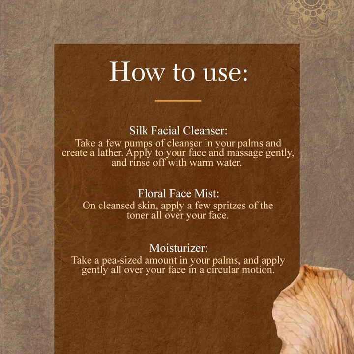 Silk Facial Cleanser: Take a few pumps of cleanser in your palms and create a lather. Apply to your face and massage gently, and rinse off with warm water.
