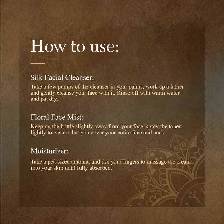 Silk Facial Cleanser: Take a few pumps of the cleanser in your palms, work up a lather and gently cleanse your face with it. Rinse off with warm water and pat dry.