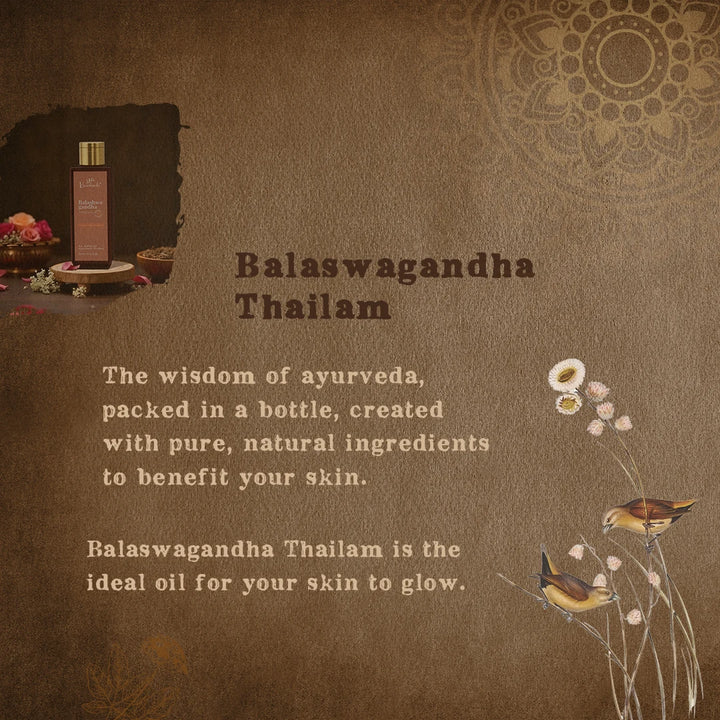Our Balaswagandha Thailam is made with the highest quality ingredients, letting you experience the full benefits of this miracle oil. Regular use leaves the skin soft and supple to the touch. The ingredients in the oil give it a natural antioxidant property, which benefits those with skin issues immensely.