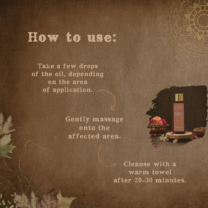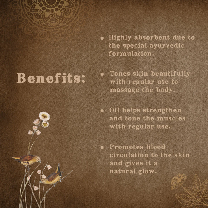 After lightly massaging the oil over the affected area, it relieves joint pain. This Ayurvedic oil, with its natural properties, has been known to tone and strengthen the muscles with regular massage. The natural ingredients in the oil are known to help with a lot of skin conditions by applying it to the affected area. A wonderful benefit of the oil is that it promotes relaxation and healthy sleep. Try our specially formulated Balaswagandha Thailam for a renewed you.