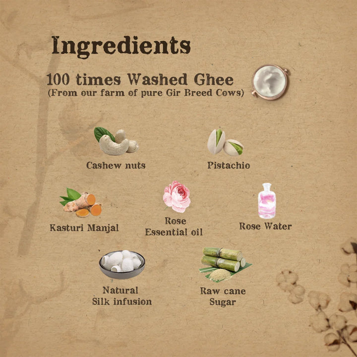 Rose Essential Oil, Hydrolyzed Silk Protein, Virgin Coconut Oil, Palm Oil, Sesame Seed Oil, Castor Oil, 100 Times Washed Ghee (From our own farm of Gir Breed Cows), Kokum Butter, Fresh Rose Petals, Raw Cane Sugar, Kasturi Manjal, Rose Water, Cashew Nuts & Pistachio Paste, Lye.