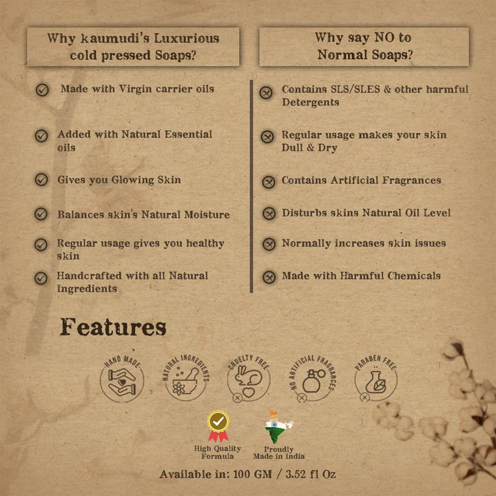Our hydrating soap is indeed luxury wrapped for you. Infused with real, fresh rose petals, the soap is fragrant and hydrating, leaving you with a sense of refreshment after each use. This special formula helps the skin retain its elasticity, allowing it to become softer and more supple. It tones the skin with regular use, which means your skin glows all day long. An essential component of our soap is 100 times washed ghee. This ingredient comes straight from our farm of pure Gir breed cows, and is 100% organic in nature.
