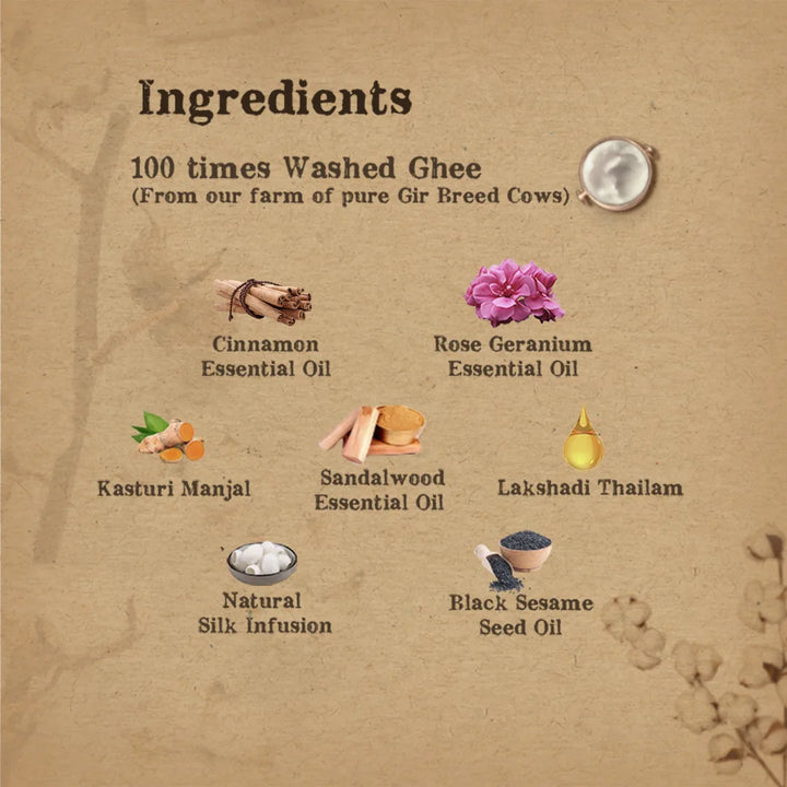 Cinnamon Essential Oil, Clove Essential Oil, Geranium Essential Oil, Hydrolyzed Silk Protein, Virgin Coconut Oil, Palm Oil, Castor Oil, 100 Times Washed Ghee (From our own farm of Gir Breed Cows), Kokum Butter, Kasturi Manjal, Kamalnal Extract, Sandalwood Extract, Lodhra Extract, Ashwagandha Extract, Bhimseni Kapoor, Extract, Cardamom Extract, Nagkesar Extract, Lakshadi Thailam, Vitamin E, Olive Oil, Black Sesame Paste, Multani Mitti, Lye.