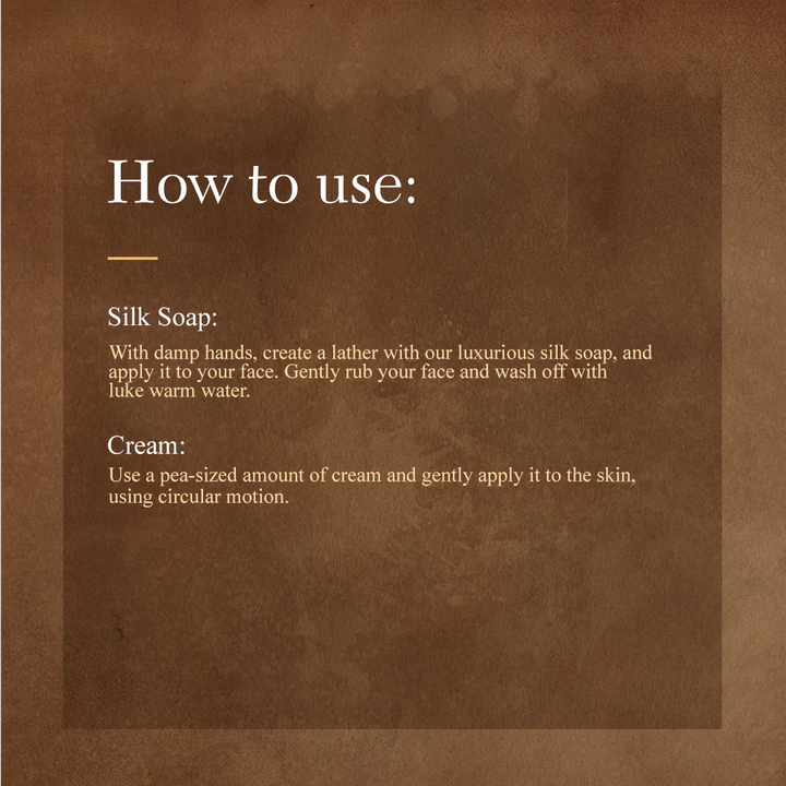 Silk Soap: With damp hands, create a lather with our luxurious silk soap, and apply it to your face. Gently rub your face and wash off with luke warm water.