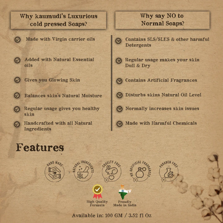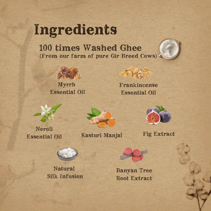 Neroli Essential Oil, Myrrh Essential Oil, Frankincense Essential Oil, Hydrolyzed Silk Protein, Virgin Coconut Oil, Palm Oil, Castor Oil, 100 Times Washed Ghee (From our own farm of Gir Breed Cows), Turmeric( Kasturi Manjal), Banyan Tree Root Extract, Fig Extract, Lye.